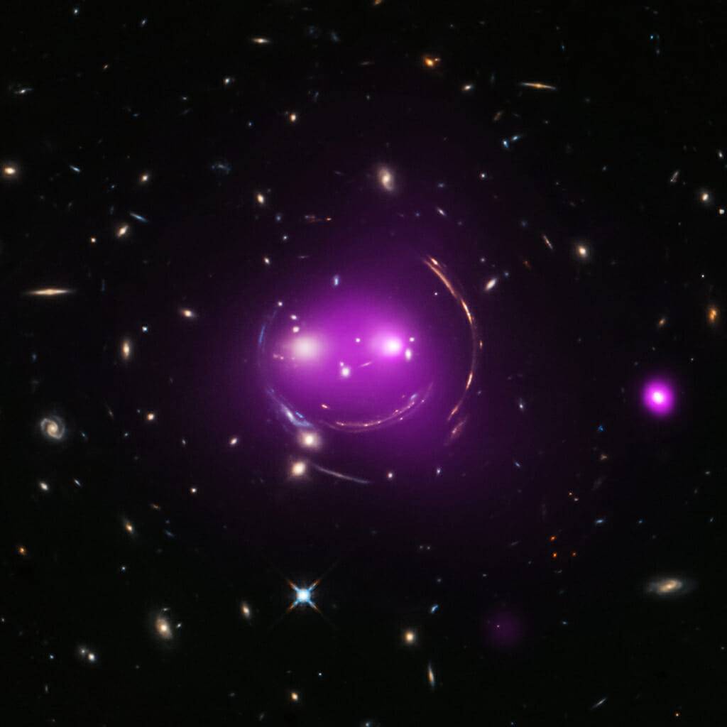 天文学の話題です。おおぐま座の方向およそ46億光年先にある銀河団がチェシャ猫そっくりなので、チェシャ猫銀河団(Cheshire Cat galaxy group)というニックネームで呼ばれているそうです。重力レンズ効果で背後の銀河像が曲げられているとのこと。