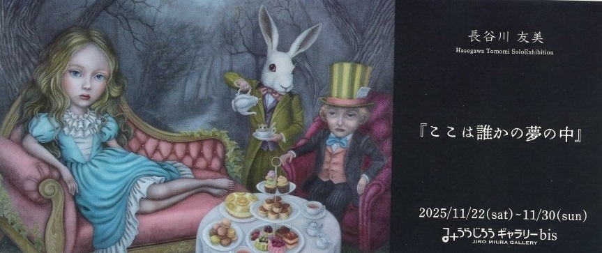 長谷川友美さんの『ここは誰かの夢の中』展が11月22日(土)〜11月30日(日)まで「みうらじろギャラリーbis」(中央区日本橋大伝馬町2−5 石倉ビル3階)にて開催。12:00〜19:00、最終日は16:00まで(休廊日 11/24、25)。長谷川さんによれば、「アリスの作品が多めです!」とのことです。長谷川さんが描くアリスの眼の色が好きです。